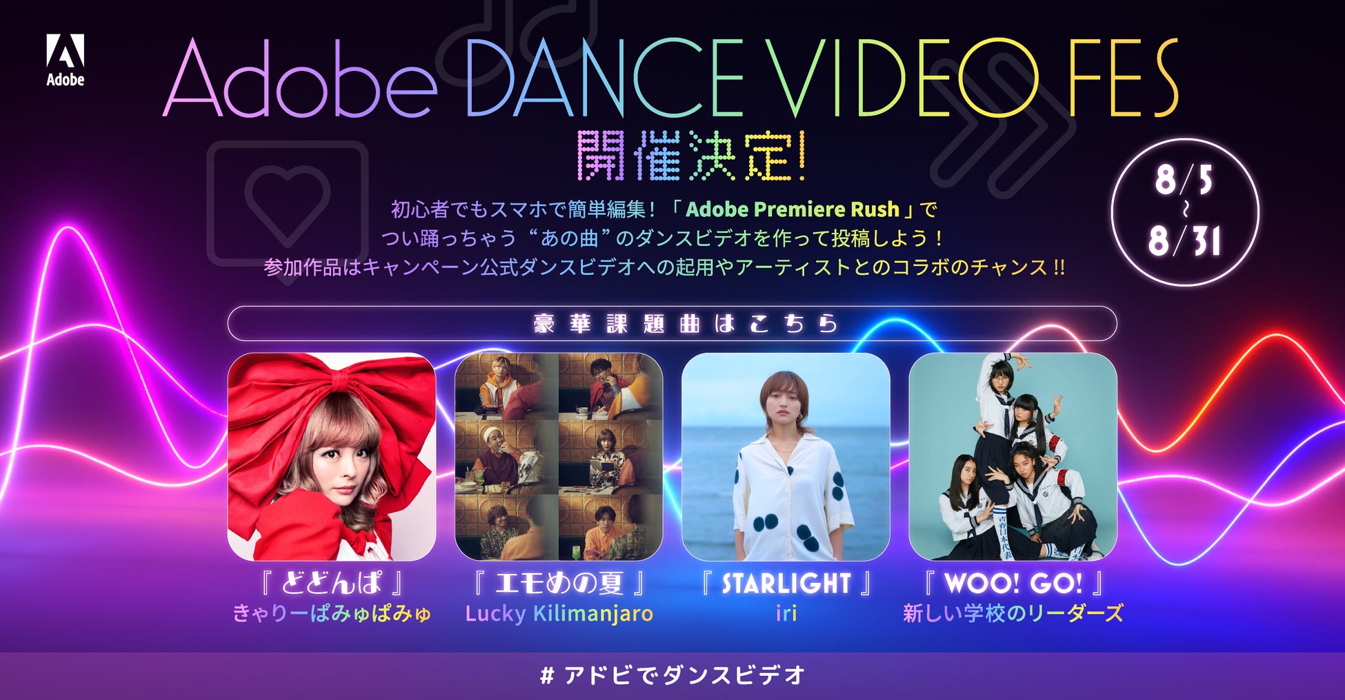 アドビ株式会社(本社:東京都品川区、代表取締役社長:神谷 知信、以下 アドビ)は、2022年8月5日(金)から2022年8月31日(水)の期間で、ダンスビデオを投稿するキャンペーン「Adobe DANCE VIDEO FES」を開始いたします。「きゃりーぱみゅぱみゅ」、「Lucky Kilimanjaro」、「iri」、「新しい学校のリーダーズ」といった、それぞれ異なる個性を持つダンスミュージックで人気の4組のアーティストが課題曲として参加。その課題曲をオリジナルのダンスで表現する「ダンスビデオ」の制作にチャレンジするキャンペーンです。「ダンスビデオ」の編集には、スマホでも簡単に編集ができるソフト「Adobe Premiere Rush(アドビ プレミア ラッシュ)」を使っていただくことで、自分で映像を編集することを身近に感じていただきたいと考えています。