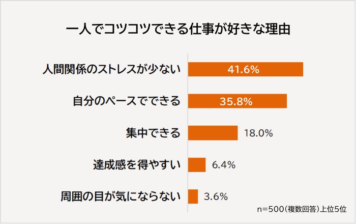 ・一人でコツコツできる仕事が好きな理由1位は「人間関係のストレスが少ない」