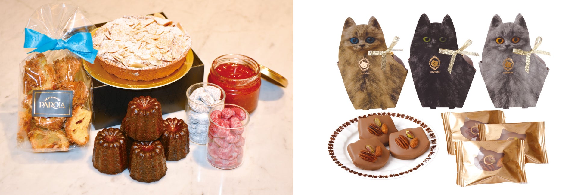 左:カヌレやシューラスク、紅白アマンドショコラの詰め合わせ ¥5,000(※限定50個)
