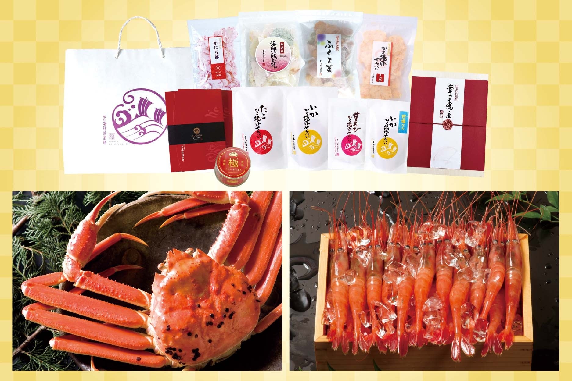 皇室に献上されることで有名な「越前がに」と今回特別に水揚げ後すぐに浜茹でし、お届けします。さらに越前三国産のお刺身用の甘えびや当店おすすめの海鮮せんべいがたっぷり付いてきます。