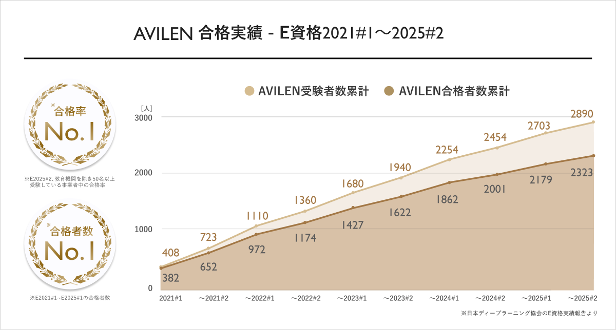 全人類がわかるE資格講座」は、AVILENが提供するJDLA認定プログラムです。2021#1~2025#1の期間において合格者輩出数No.1(※1)、累計2,323名の合格者を輩出しています。