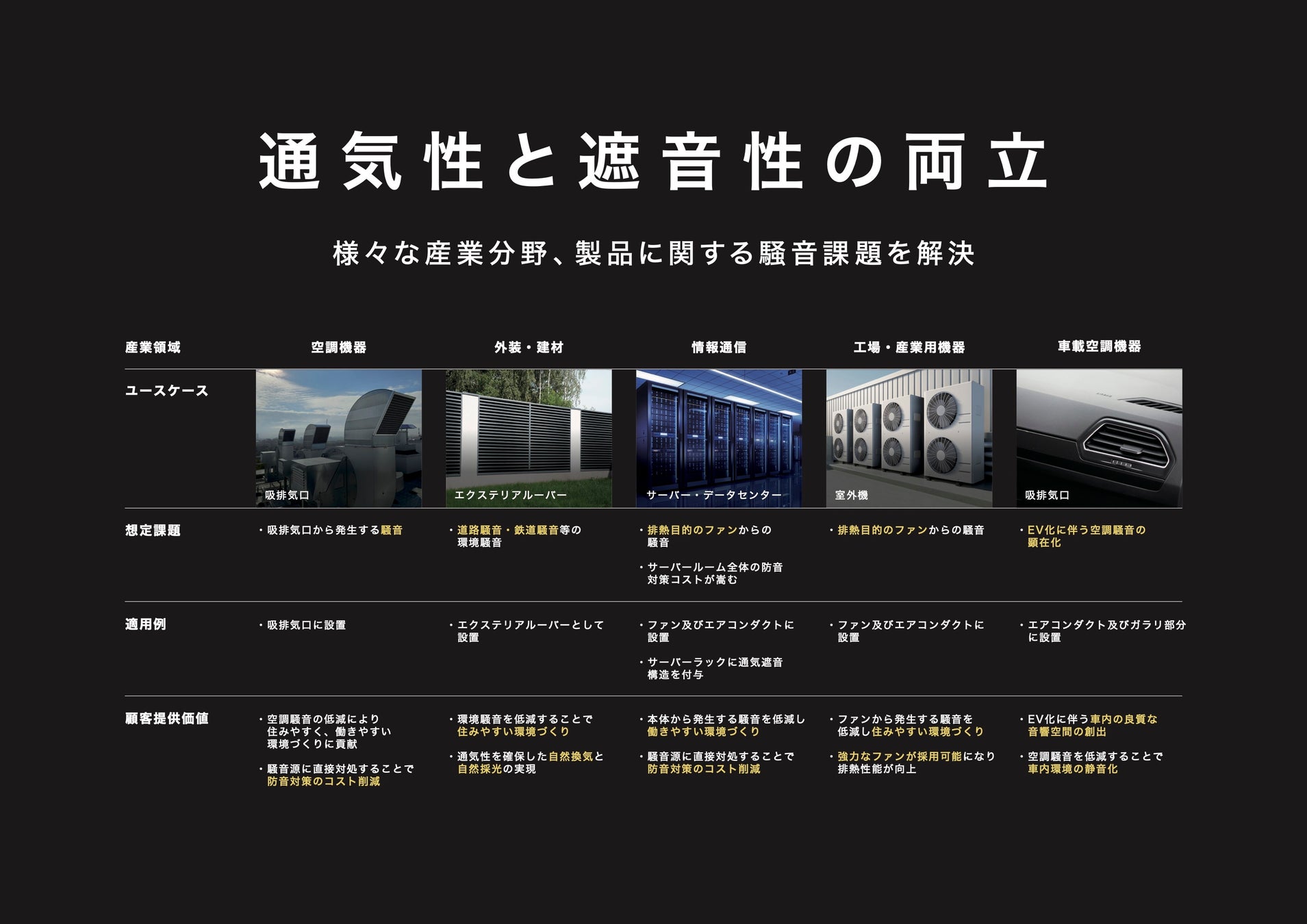 メタマテリアルをベースとしたPxDT独自の音響制御技術。素材の選択自由度と加工自由度の高さ、吸音・遮音周波数帯域の柔軟な設計、「通気×遮音」「軽量×吸音」といったこれまでのトレードオフ関係を破壊できることが提供価値です。これらの提供価値を活かしながら、さまざまな産業分野での騒音課題の解決に貢献します。