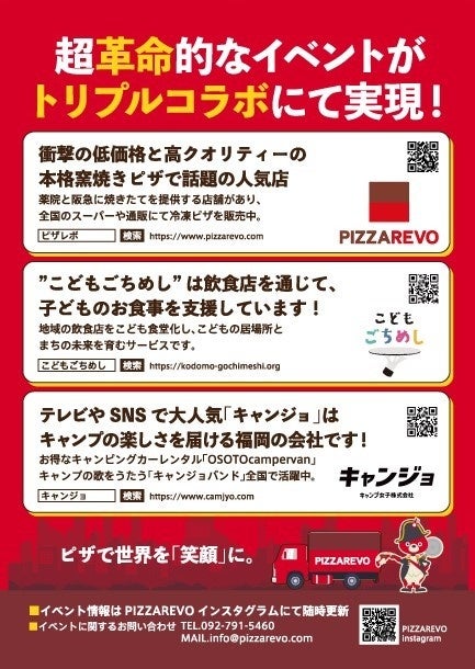 株式会社PIZZAREVO(本社:福岡県福岡市、代表取締役:藤井邦彦)とGigi株式会社(本社:福岡市、代表取締役:今井了介)、キャンプ女子株式会社(本社:福岡市、代表:橋本華恋)は、福岡発地元企業としてコラボレーションを行い、世界こどもの日とピザの日を記念して、来場者全員へピザのプレゼントや、お食事券、アウトドア体験ができる空間などを提供いたします。