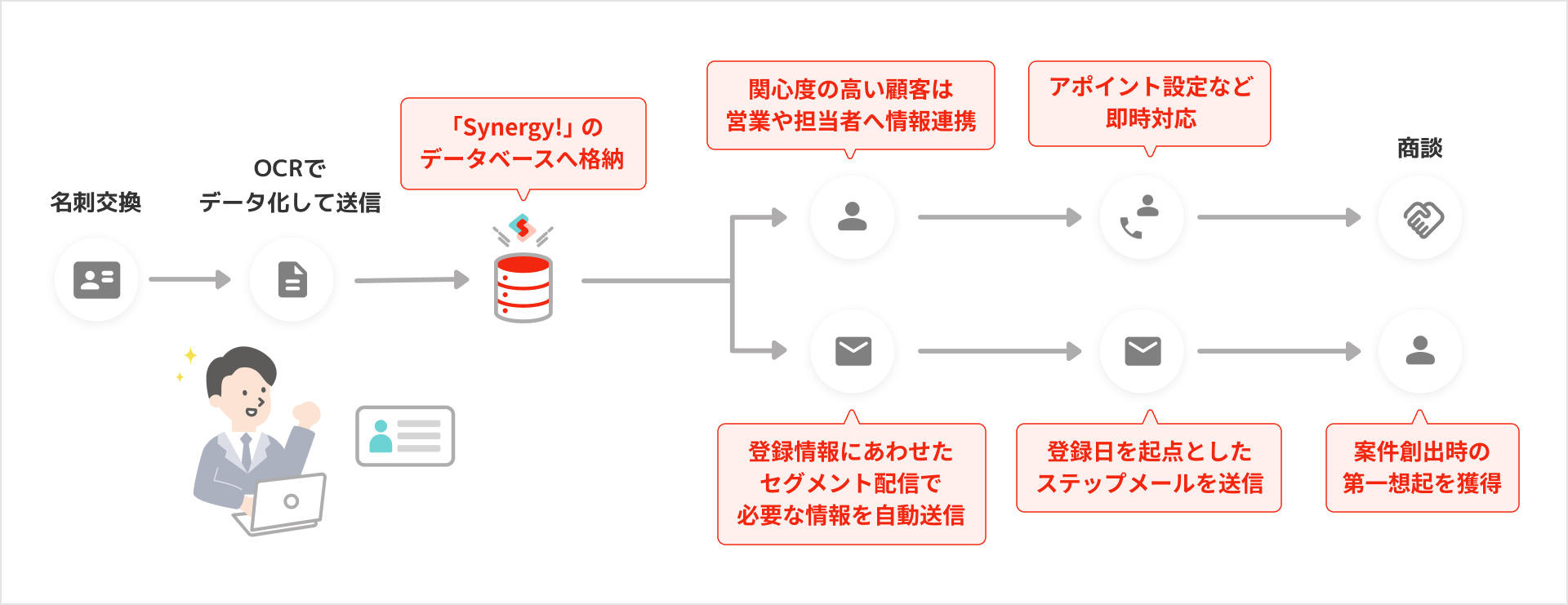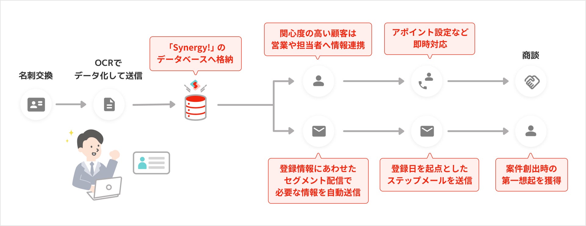 Synergy!は、こうした担当者のリソース不足を解決するため、単なるOCR(文字認識)によるデータ化にとどまらない機能を開発しました。「名刺を撮った瞬間、マーケティングの歯車が自動で回り出す」という体験を提供し、リード獲得から商談創出までのプロセスを自動化します。