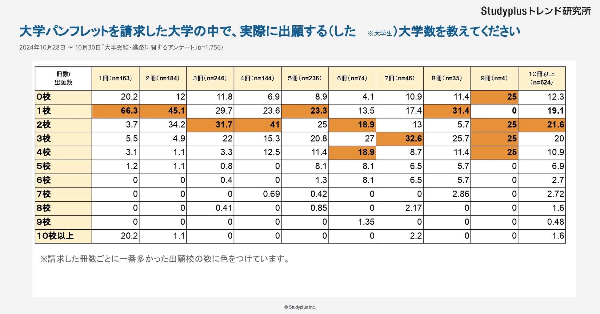 下の表では各冊数ごとに、実際に出願した校数が一番多かったところに色をつけています。どの冊数でも1校から4校に出願する人が多くなっています。一人当たりの平均出願数は2.37校*です。