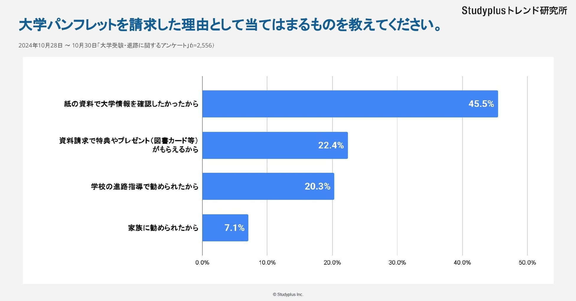 大学パンフレットを請求した理由は「紙の資料で大学情報を確認したかったから」が45.5%「資料請求で特典やプレゼント(図書カード等)がもらえるから」が22.4%「学校の進路指導で勧められたから」が20.3%「家族に勧められたから」が7.1%となりました。