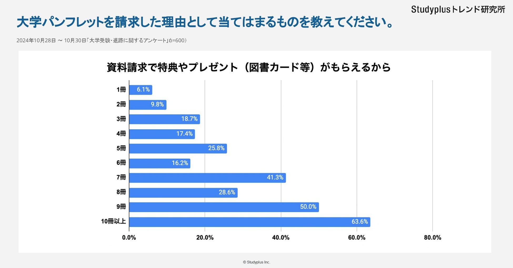 このうち「資料請求で特典やパンフレット(図書カード等)がもらえるから」と答えた人は10冊以上請求した人の63.6%、9冊以上請求した人の50.0%となりました。
