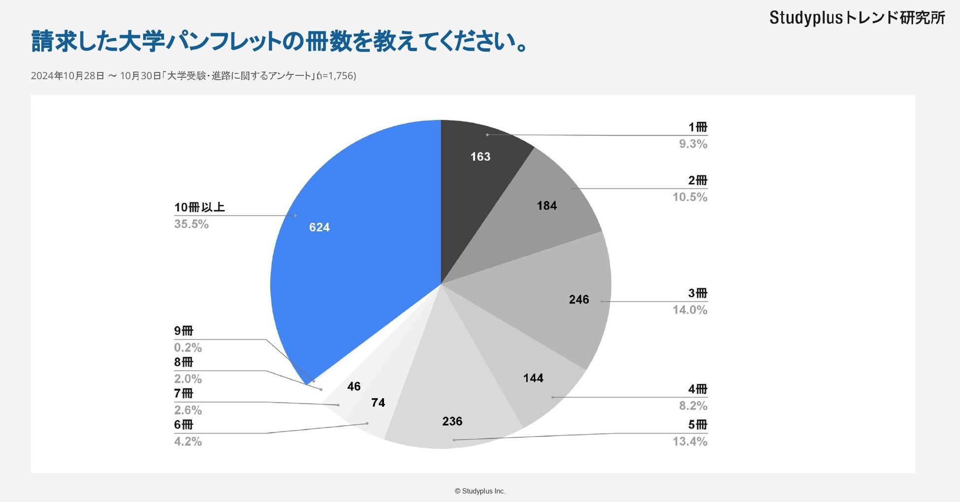 高校生や大学生が大学パンフレットをどのように利用しているのか調査しました。請求した冊数ごとに人数を見ていくと、一番多かったのは「10冊以上」で全体の35.5%となりました。