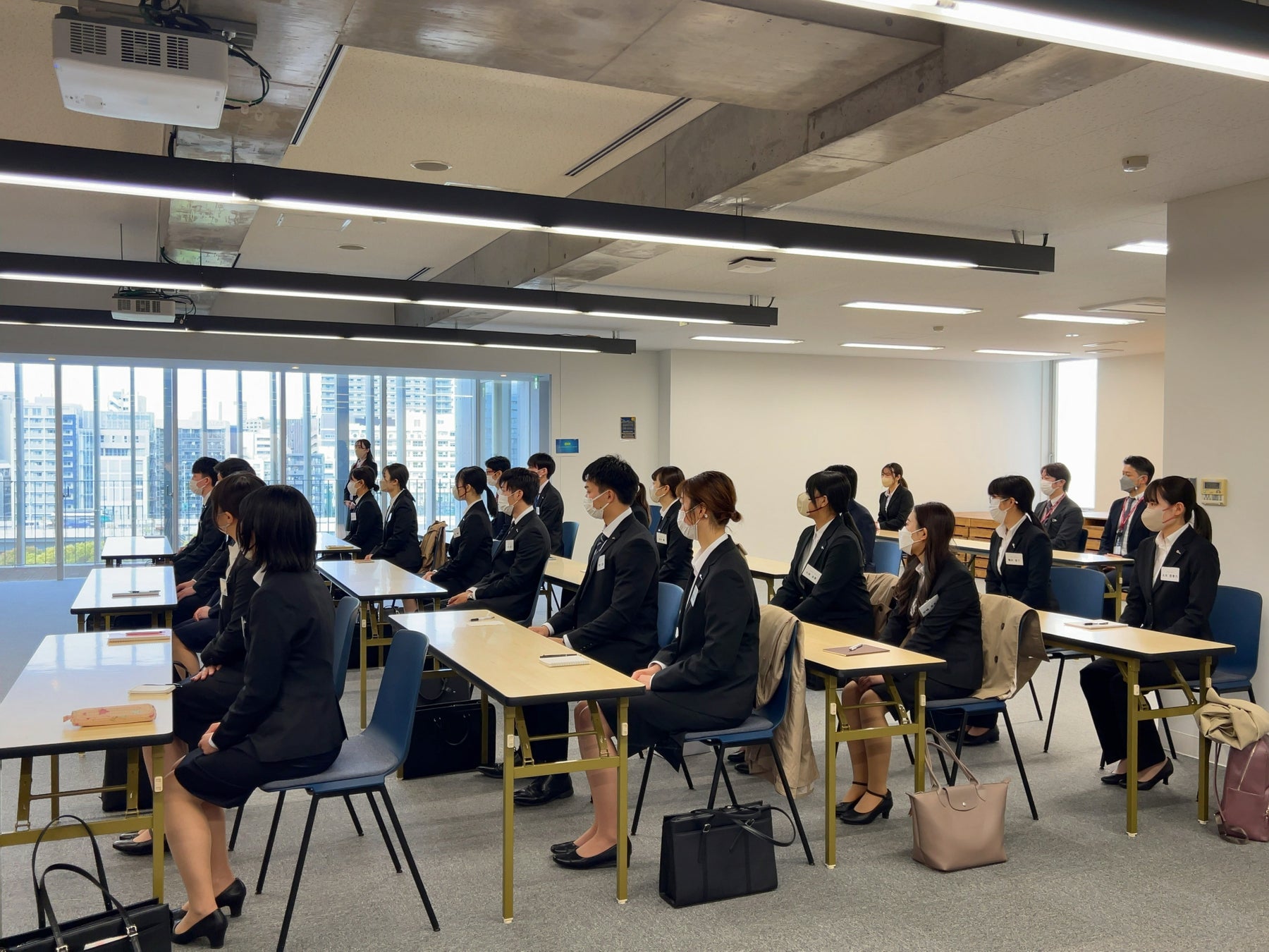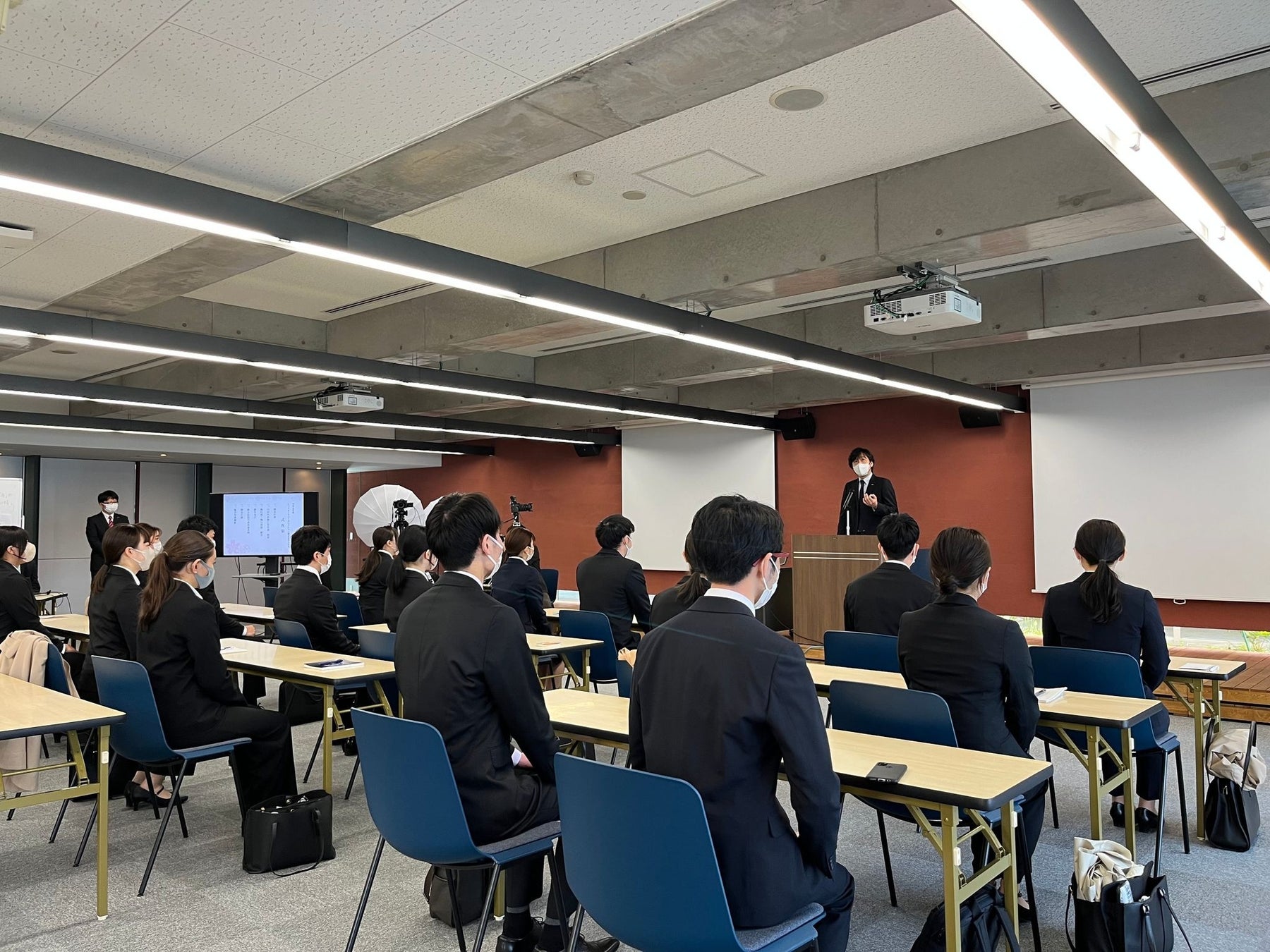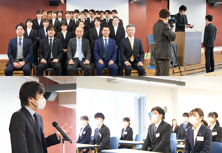 入社式では経営幹部から新入社員に向けて歓迎の言葉が贈られました。代表執行役社長の山田は、ある大学教授が授業で話し反響を呼んだ「マヨネーズ瓶と2杯のコーヒー」の話を用いながら、大切なものを見極め充実した社会人生活を送って欲しいというメッセージを込めた祝辞を述べ、新入社員の士気を高めました。この入社式の様子は、昨年同様に社内SNSにてオンライン配信され、全国各地で従事する社員が各々の場所で新入社員を歓迎しました。