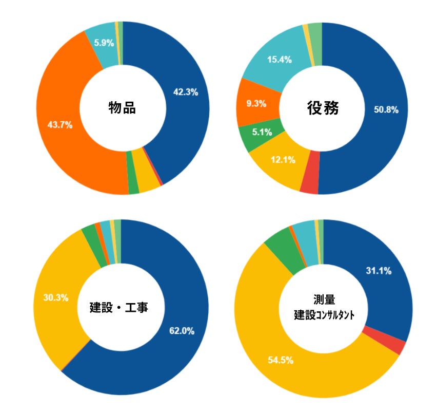 建設・工事では、「一般競争入札」が62.0%と最も多く、指名競争入札と合わせて競争性のある入札形式が合計90%以上を占めており、公平性と透明性が重視されていることがわかります。