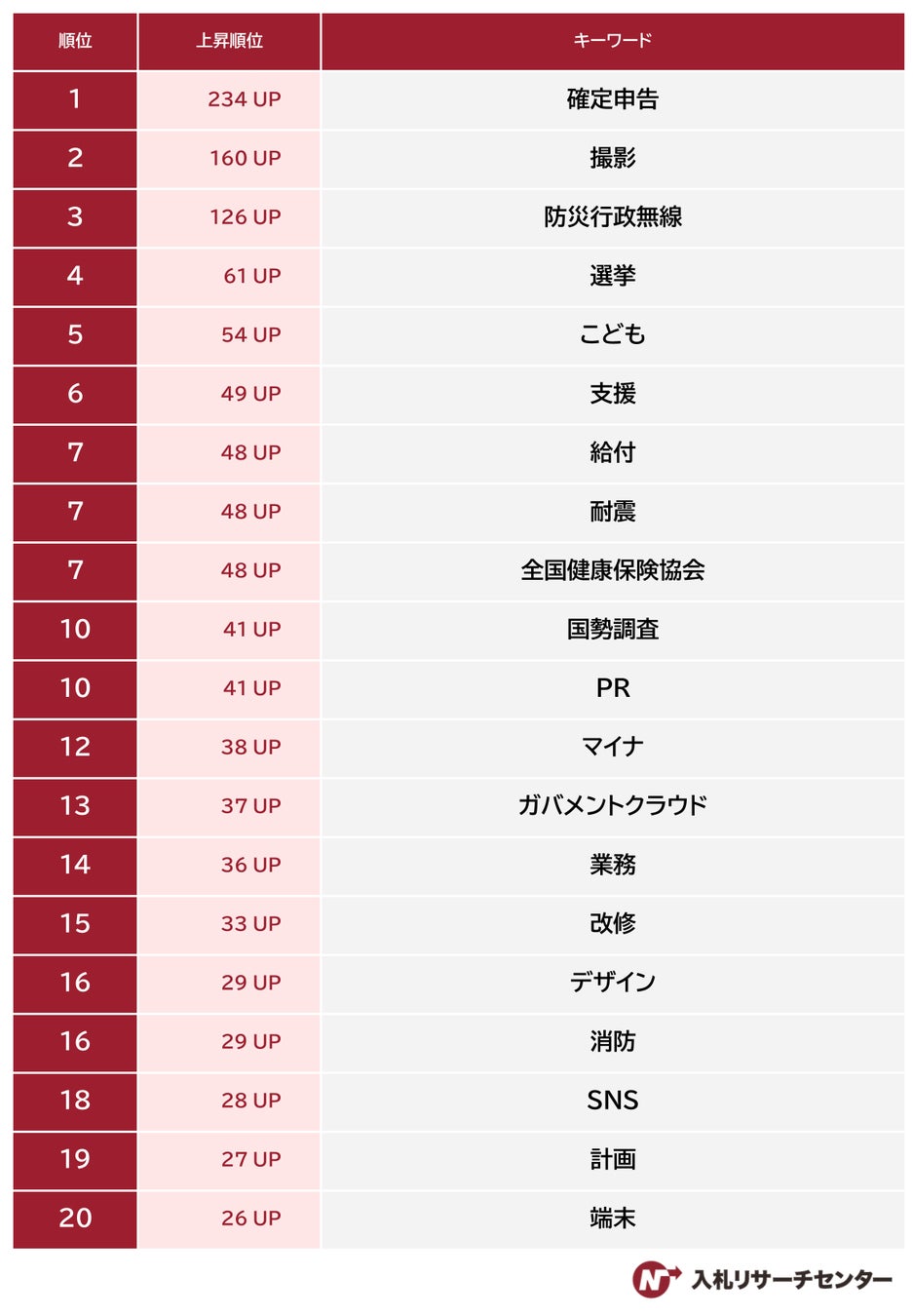 ・入札情報速報サービスNJSSユーザーが検索したキーワードを元に、前月と比較して上昇幅の大きいキーワードをランキング