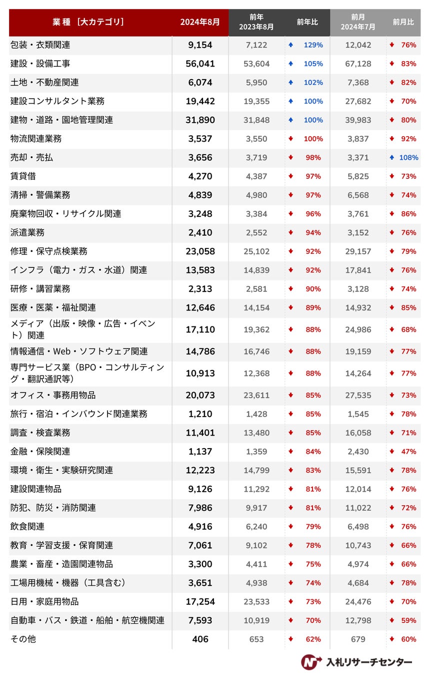 2024年8月の業種カテゴリ別公示案件数は、多くの業種が減少傾向となりました。前年比で最も伸びている業種は「包装・衣類関連」でした。