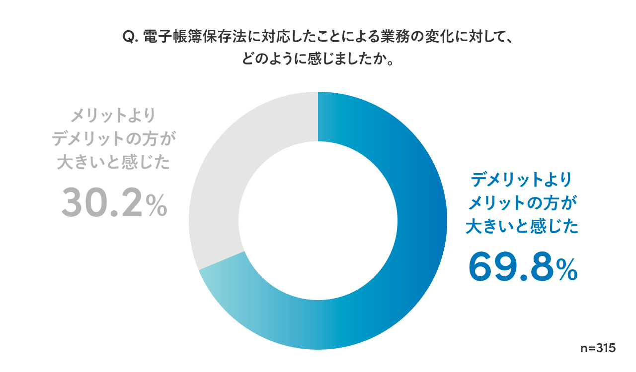 続いて、改正電子帳簿保存法に対応したと回答したビジネスパーソンに対し、対応後の業務の変化について聞いたところ、「デメリットよりメリットの方が大きいと感じた」が69.8%で、「メリットよりデメリットの方が大きいと感じた」が30.2%となっており、約7割がメリットを感じていることが分かりました。