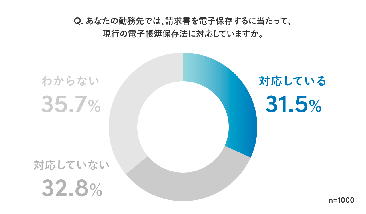 請求書関連業務に携わる1000名のビジネスパーソンに対して、改正電子帳簿保存法に対応しているか聞いたところ、「対応している」と答えたのは31.5%で「対応していない」が32.8%、「分からない」が35.7%でした。