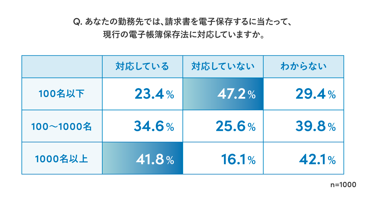 ・改正電子帳簿保存法に対応しているのは3割で、従業員規模が大きな会社ほど対応が進んでいる傾向がある