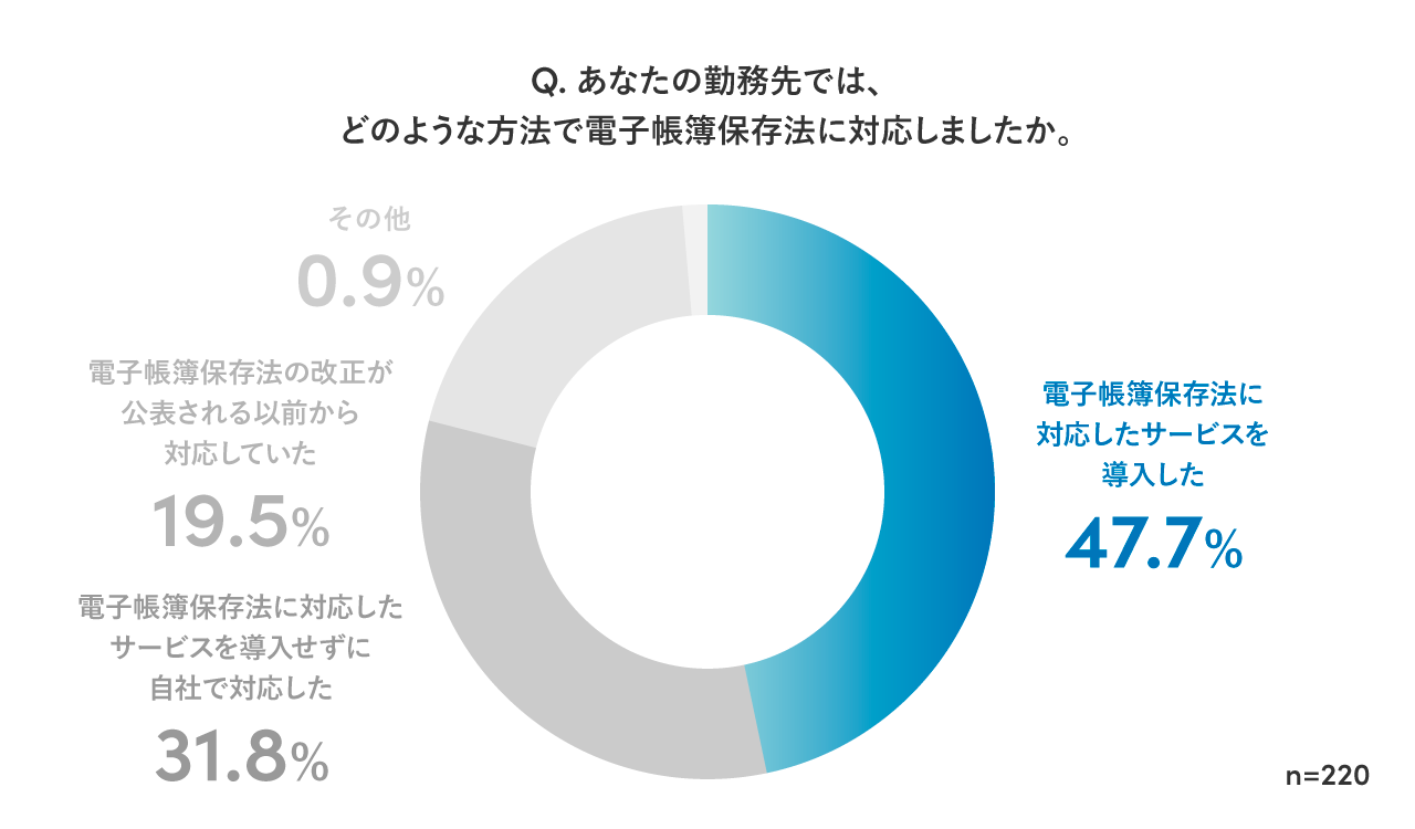 今回の調査で、2022年1月に施行された改正電子帳簿保存法への対応は、大企業ほど進んでいるという現状が分かりました。人員や予算のリソースがある大企業と比較すると、中小企業においては「紙依存の業務フローを変更するのが難しい」「外部ツール導入の費用が無い」といった課題が影響していると考えられます。