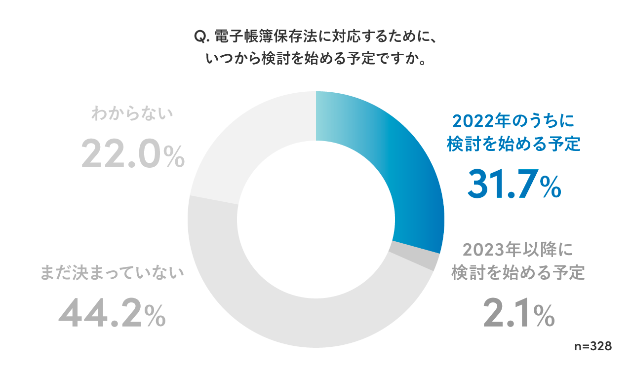 改正電子帳簿保存法に対応していないと答えた人に対して、いつから検討をはじめるのかを聞いたところ、「2022年のうちに検討を始める予定」が31.7%、「2023年以降に検討を始める予定」が2.1%、「まだ決まっていない」が44.2%、「分からない」が22.0%という結果となりました。約3割は、宥恕措置を利用し、請求書業務のフローを再構築する機会と捉えていることが分かりました。一方、約7割においては、検討時期が決まっていない状況であることが分かりました。