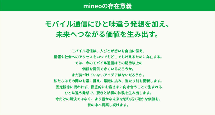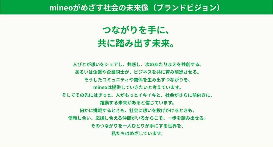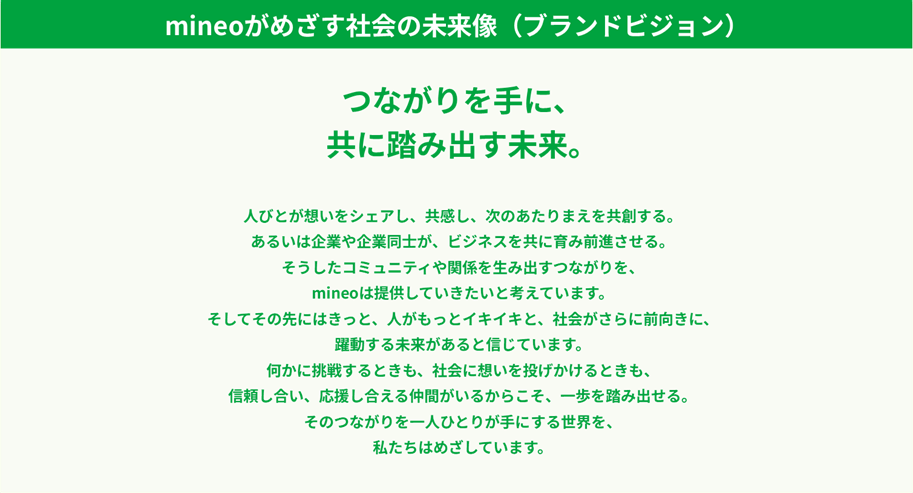 通信の役割が個人の暮らしのみならず、企業・地域・社会の課題解決手段として注目度・重要性が増す中、mineoは「共に創る」姿勢を個人だけでなく、企業・社会へ拡張し、徹底的にお客さまに向き合いながら想いをつなぎ、通信の力で新しい価値創出に挑戦する存在意義と、その活動を通してめざすべき社会の未来像を改めて制定しました。