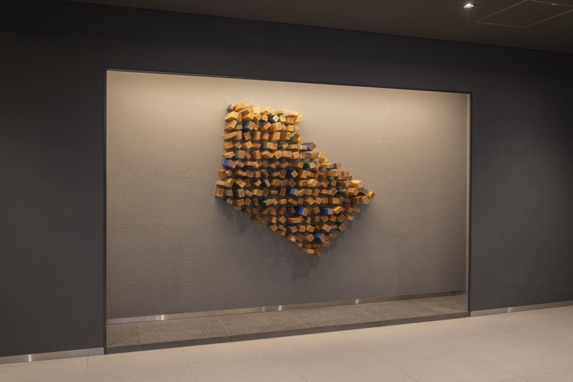 エントランスラウンジのテーブルやスツールに国産タモ材を活用しています。さらに、テーブルなどの作成時に生じた端材を、エントランスに展示しているアートや小物の一部として再利用しています。