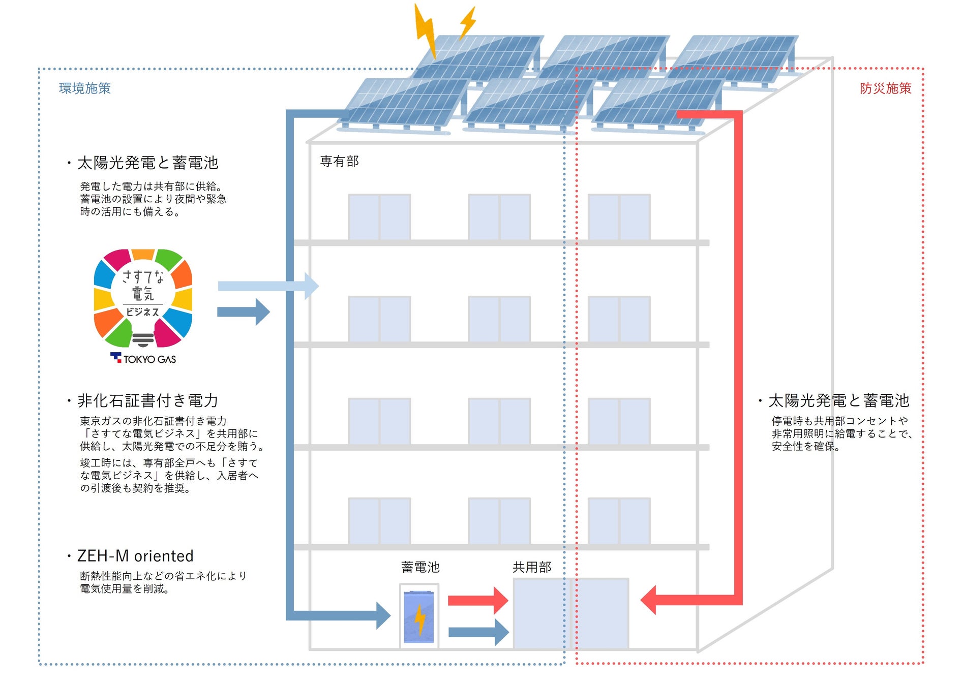太陽光発電で賄いきれない共用部電力については、東京ガス株式会社が非化石価値取引市場で調達するトラッキング付き非化石証書が付与された電力「さすてな電気ビジネス(※5)」の供給を受けます。専有部電力についても全戸へ「さすてな電気ビジネス」を供給しており、入居者への引渡後も契約を推奨することで、再エネ化に努めます。
