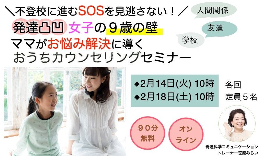 不登校に進むSOSを見逃さない 発達凸凹女子の9歳の壁!ママがお悩み解決に導く『おうちカウンセリング』無料オンラインセミナー開催