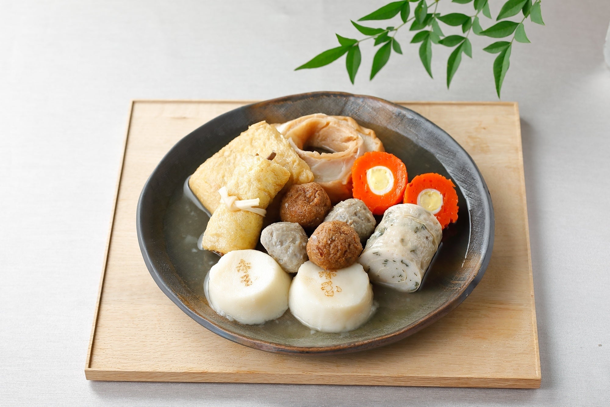 (カニ面・車麩・肉いなり・赤玉ばくだん・信田巻・金時草湯葉巻×各1、肉団子・にぎすつみれ・海老しんじょう×各2 計9種12個・出汁500㎖)