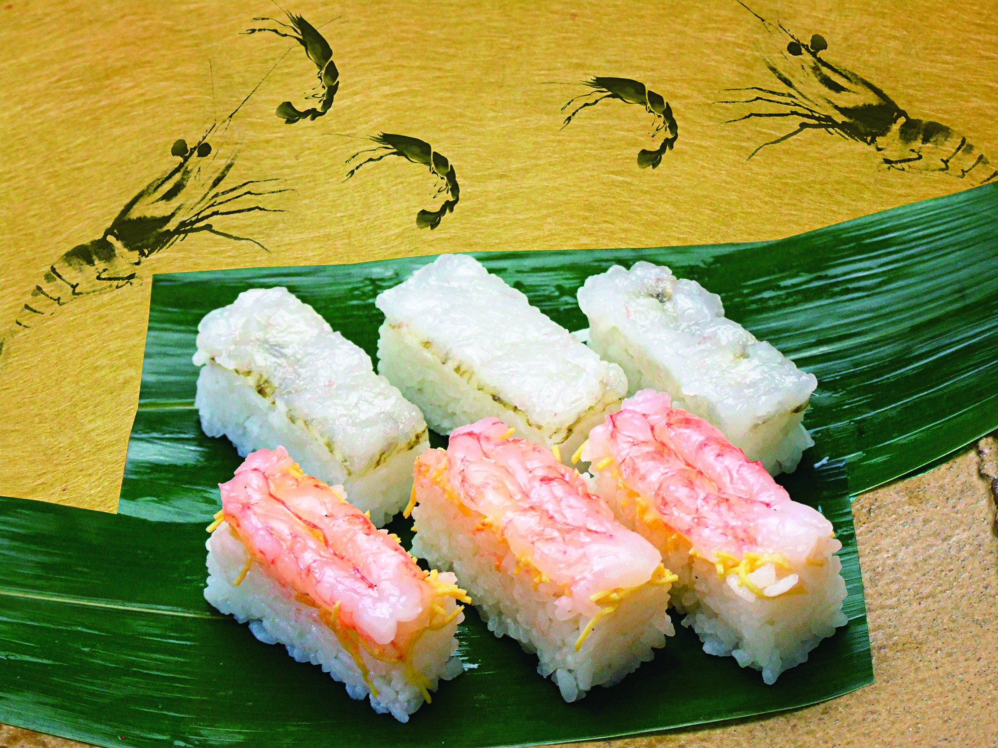 ●石川/金澤玉寿司「『彩華』白えび甘えび押寿司」(6貫) 1,404円 実演