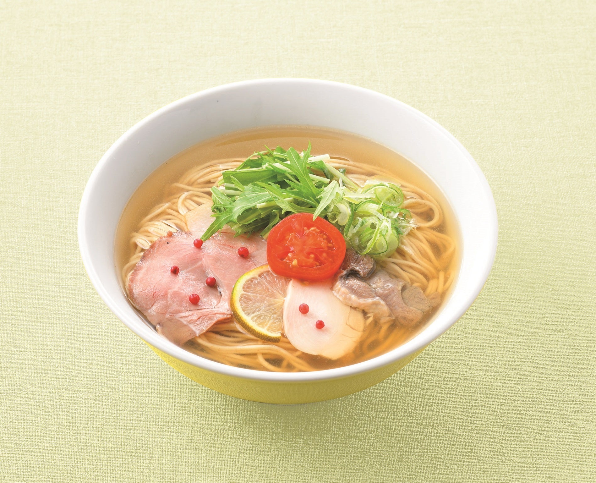 福井県内に4店舗を展開する「福井らーめん 五目亭」。国産の純鶏(親鶏)と煮干しを合わせたやさしい味わいのWスープに、ふすまを練り込んだ自家製の麺を使用。国産純鶏(親鶏)のたたき、鶏・豚二種類のチャーシュー、越前水菜などをトッピングした、県産食材にできる限りこだわった一杯です。