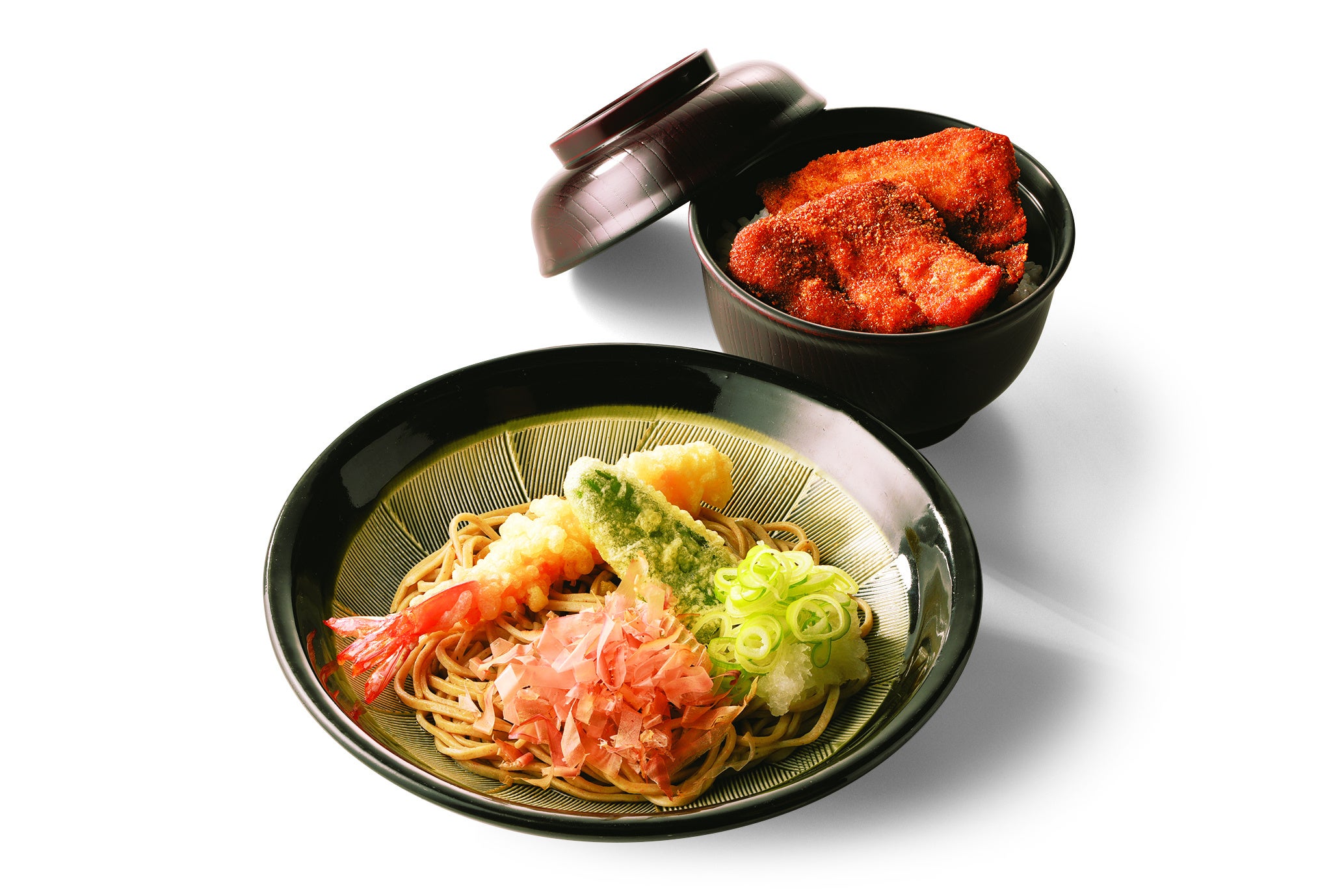 福井駅近くにそれぞれ店舗を構える、昭和24年創業の老舗そば店と創業100余年・元祖ソースカツ丼の店として知られる洋食店の人気メニューがコラボレーション。みぞれ状の大根おろしが入った出汁を冷たいそばにかけて食べる福井名物の越前そばと、カラッと揚げた豚ロース肉とモモ肉のソースカツ丼が味わえる京王百貨店限定のセットメニューです。
