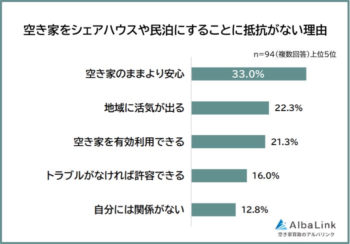 「空き家をシェアハウスや民泊にすることに抵抗がない」と答えた94人に理由を聞いたところ、1位は「空き家のままより安心(33.0%)」でした。以下、2位「地域に活気が出る(22.3%)」、3位「空き家を有効利用できる(21.3%)」が続きます。