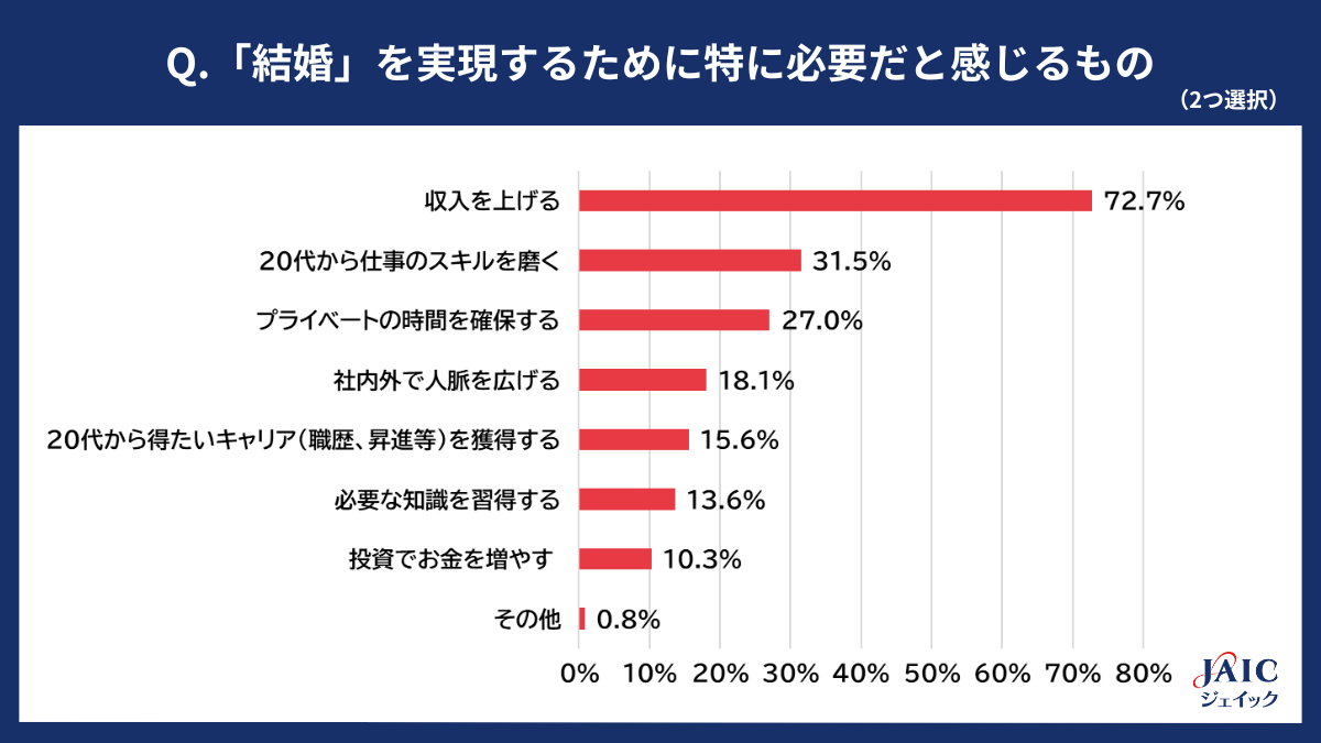上記で「結婚」と回答した方に、「「結婚」を実現するために特に必要だと感じるものを、2つ選択してください」と質問したところ、「収入を上げる」が72.7%、「20代から仕事のスキルを磨く」が31.5%、「プライベートの時間を確保する」が27.0%、「社内外で人脈を広げる」が18.1%、「20代から得たいキャリア(職歴、昇進等)を獲得する」が15.6%、「必要な知識を習得する」が13.6%、「投資でお金を増やす」が 10.3%、「その他」が0.8%となりました。
