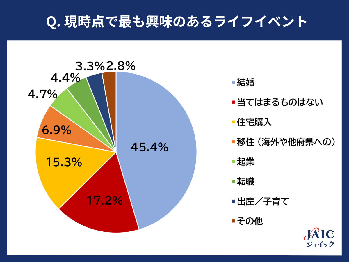 「現時点で最も興味のあるライフイベントとして、当てはまるものを1つ選択してください」と質問したところ、「結婚」が45.4%、「当てはまるものはない」が17.2%、「住宅購入」が15.3%、「移住 (海外や他府県への)」が6.9%、「起業」が4.7%、「転職」が4.4%、「出産/子育て」が3.3%、「その他」が2.8%となりました。