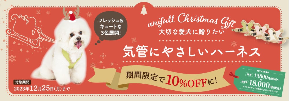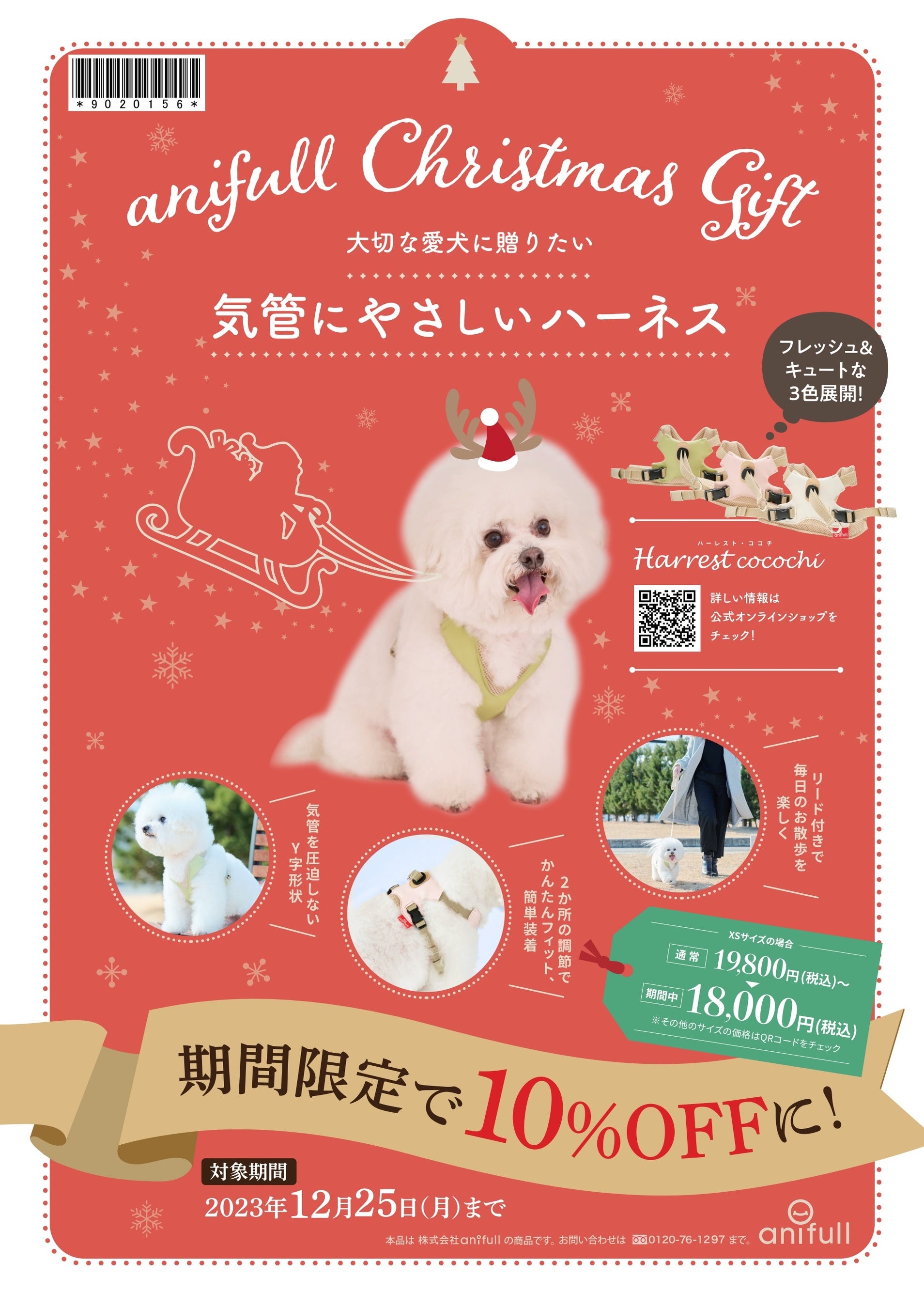 株式会社anifullは、2023年11月で2周年を迎えました。少しずつですが、お客さまにanifull製品をご活用いただく機会が増えており、大変ありがたく思っております。この記念に、日ごろの感謝を込めて、クリスマスキャンペーンを実施いたします。2023年9月に販売を開始した、気管を圧迫しないハーネス「アニサポ ハーレスト cocochi」を、期間限定の10%OFFで販売いたします。