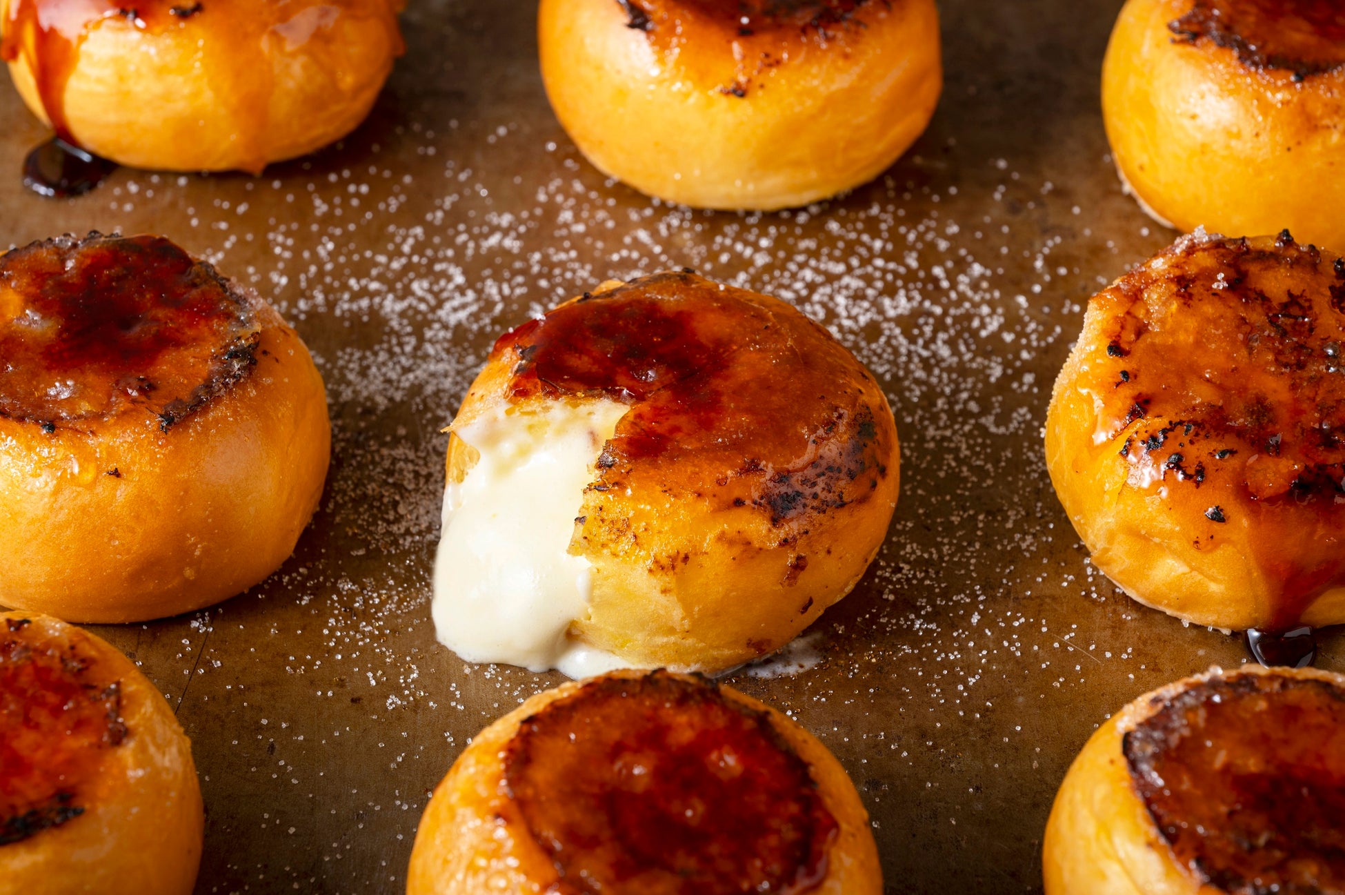 くりーむパンをアレンジした、八天堂のカフェやオンラインショップで人気のお品です。カリっとキャラメリゼした生地と、とろけるクリームがマッチした逸品です。(冷蔵商品です)