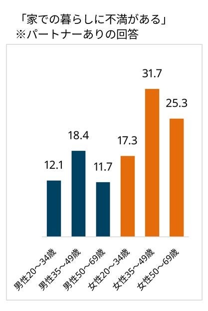 家での快適さや満足度についてパートナーと同居している男女で比較すると、いずれの年代も女性のほうが不満に感じていることがわかりました。特に仕事や家庭、その両方に追われている35-49歳の女性の多くが不満を抱いているようです。