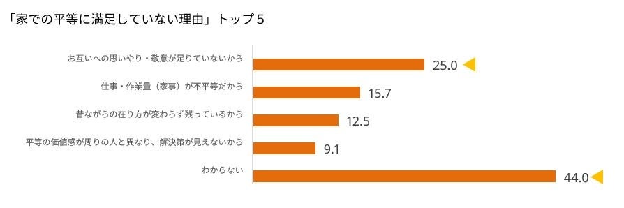 家での満足度を男女で比較した結果、違いがありましたが家での平等に満足を感じる理由は、男女ともに1番は「お互いに思いやり・敬意をもって接しているから」と全体の半数近く(42.3%)が回答。その一方で、家での平等に不満を感じる理由としても、4人に1人(25%)が「お互いへの思いやり・敬意が足りていないから」と回答しています。家での平等において、お互いへの思いやりや敬意がカギとなっているようです。また、満足はしていないが、理由が「わからない」という人が44%もいました。平等のありかたに悩んだり、または理由を考えたことない方が多いのかもしれません。