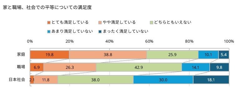 家と職場、社会での平等についての満足度について、家での平等に満足していると回答した人(「とても満足している」「やや満足している」の合計)は、58.6%と半数以上に達していました。しかし、職場、社会とマクロになるにしたがって、満足している人の割合が急激に減っています。また、満足していないと回答した人の割合もマクロになるにしたが増えています。