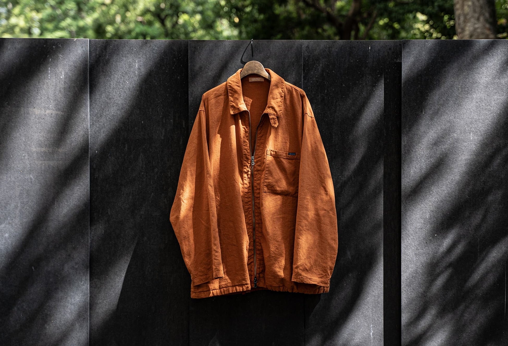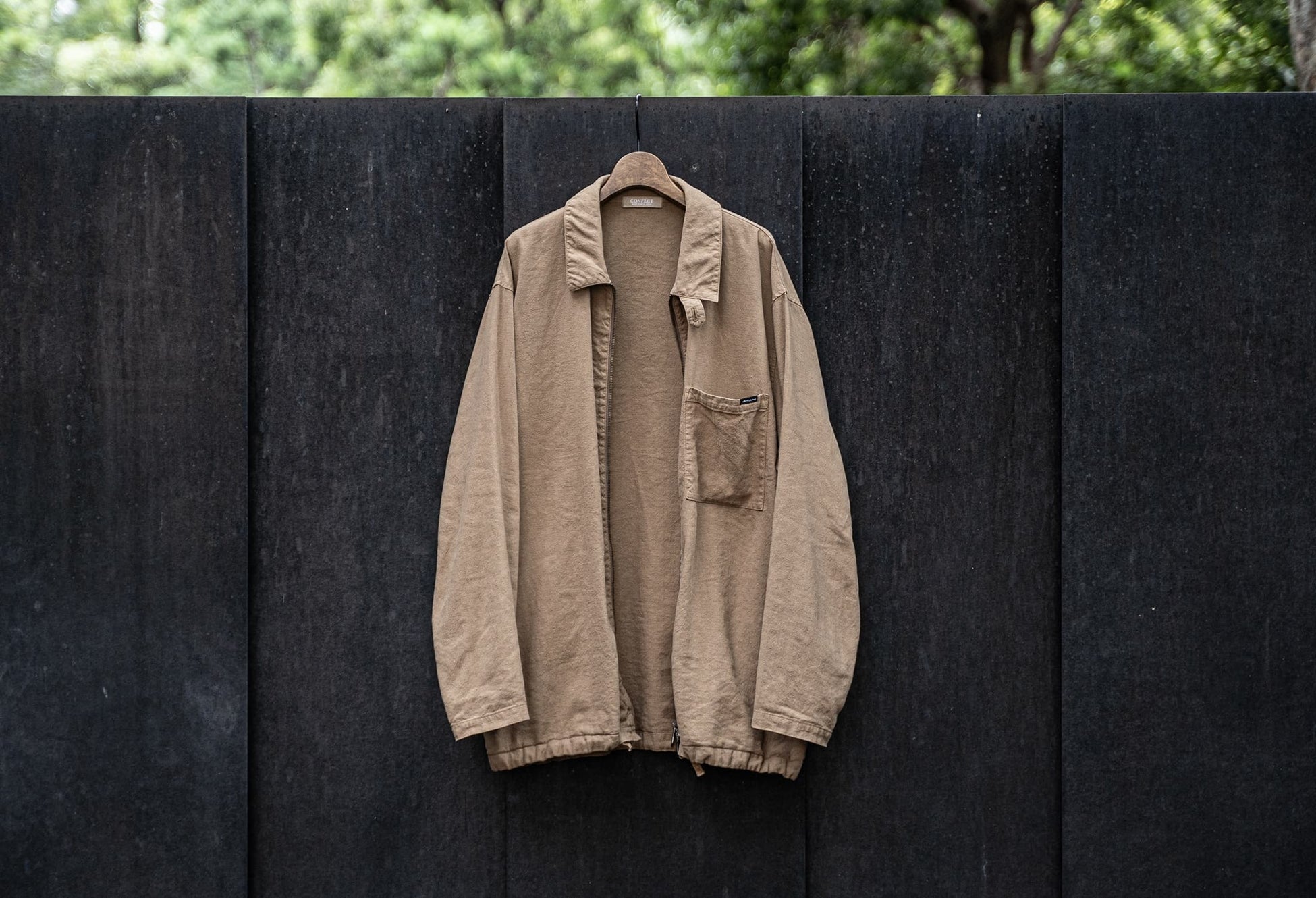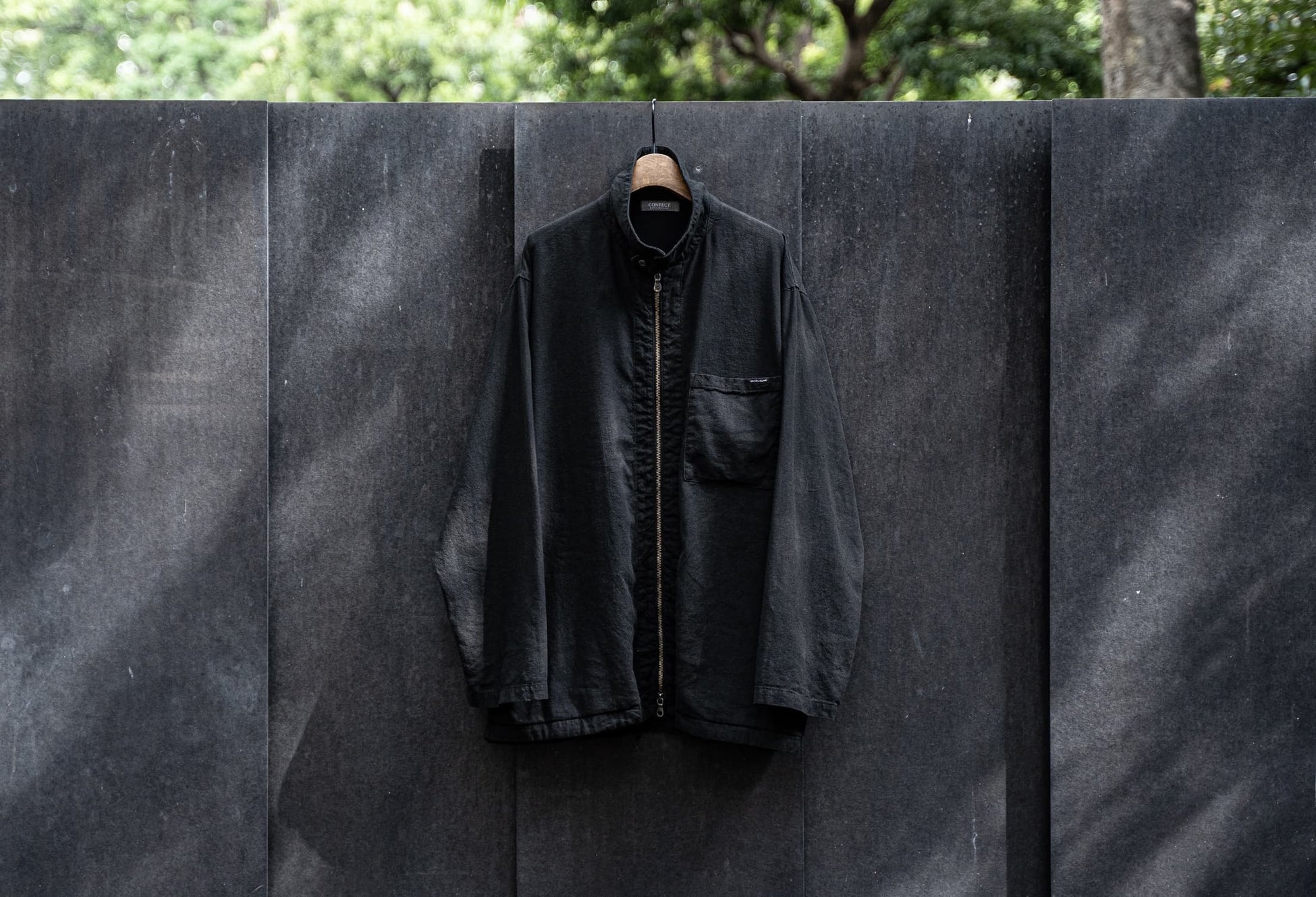 CONFECTの新型・ジップ開閉のシャツアウターの登場。リネンと綿麻リサイクル糸を掛け合わせた、自然素材100%に超撥水加工を施し、レインウェアとしても機能。生地には近江晒しが加えられ、凹凸感のある質感に。細かなシワが、製品染めの色に深みを加えてくれます。