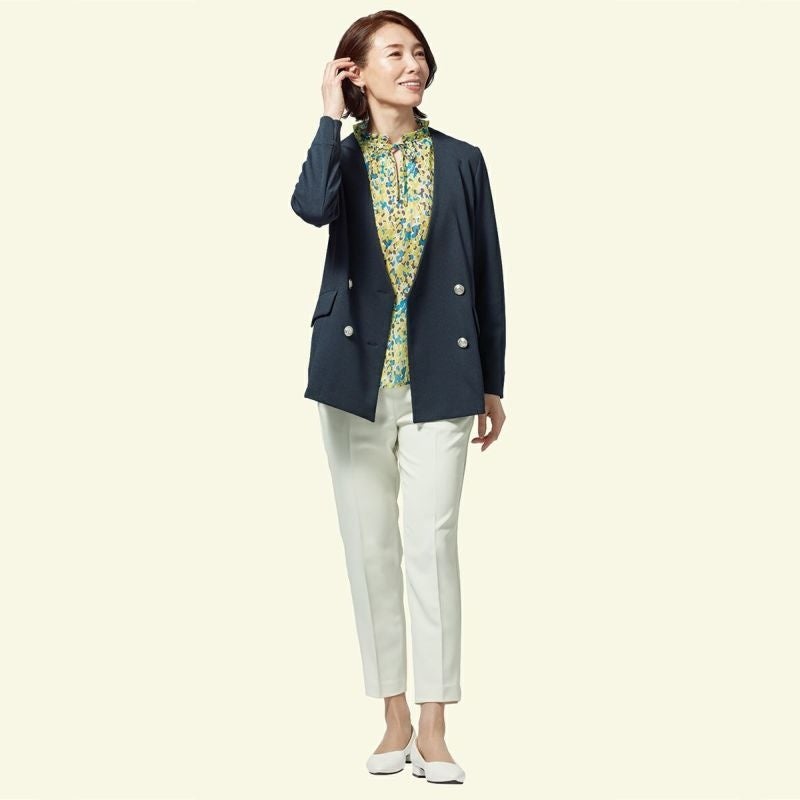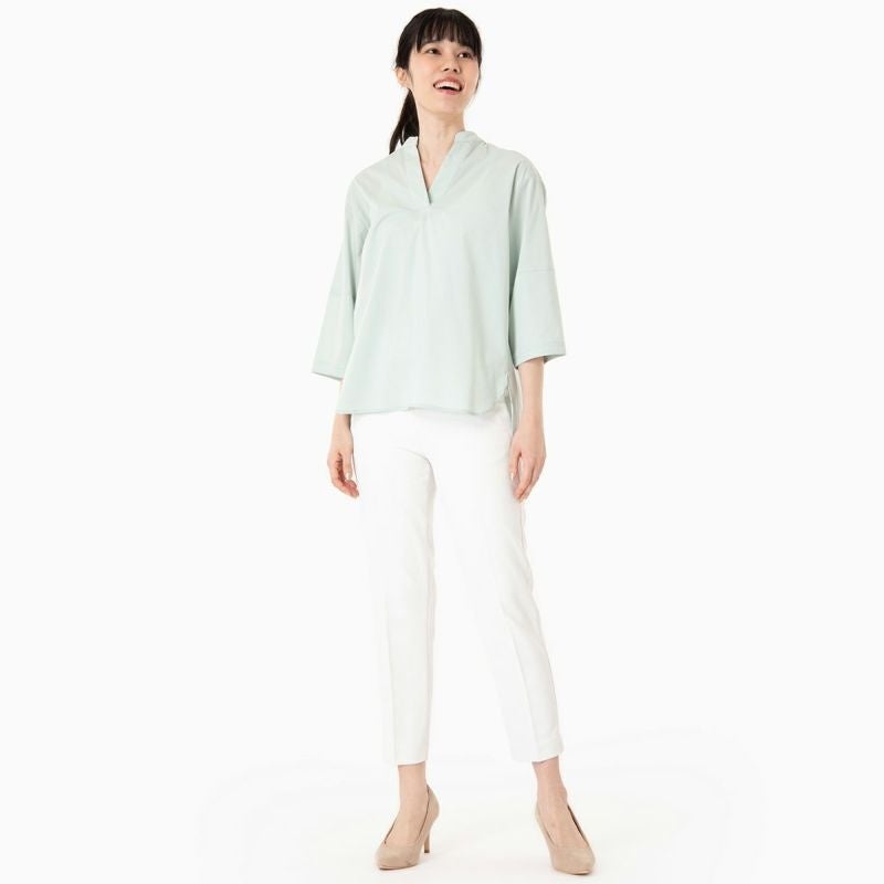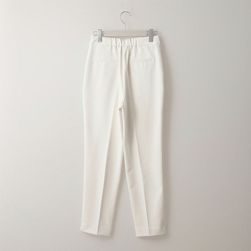 パンツの生地の裏面を肌に近い色にしているため、インナーが透けにくく、安心しておしゃれを楽しんでいただけます。シルエットは、前にも後ろにもセンターラインの入ったテーパードなので、気になる体のラインをカバーしつつ、「きちんと見え」を叶えます。サイドジップ仕様のため脱ぎ着しやすく、ウエスト周りの仕様もすっきりしているため、ブラウスをインしたスタイルも楽しめます。春のオフィスシーンやおでかけにぴったりなアイテムです。