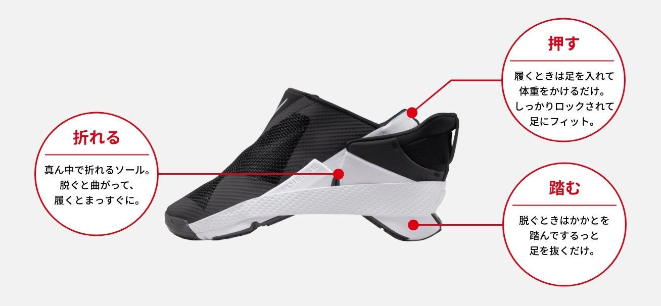 『GO FLYEASE』は、NIKEのデザイン、イノベーション、そして最先端の技術の集結により、2021年2月に開発された“変形”による着脱システムを搭載した革新的なシューズです。屈曲するソールや踏むだけで脱ぐ手間を軽減するデザインなど、手を使わずに簡単に脱ぎ履きができる独自の仕組みは、日常生活の中で靴の着脱頻度が高い方や急いでをはじめ妊婦の方や体の動きが制限されている方など、あらゆる人の一歩をサポートしてきました。