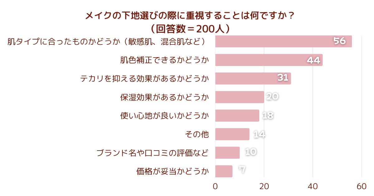 「メイクの下地選びの際に重視することは何ですか?」とアンケート調査した結果、1位は『肌タイプに合ったものかどうか(敏感肌、混合肌など)』でした。