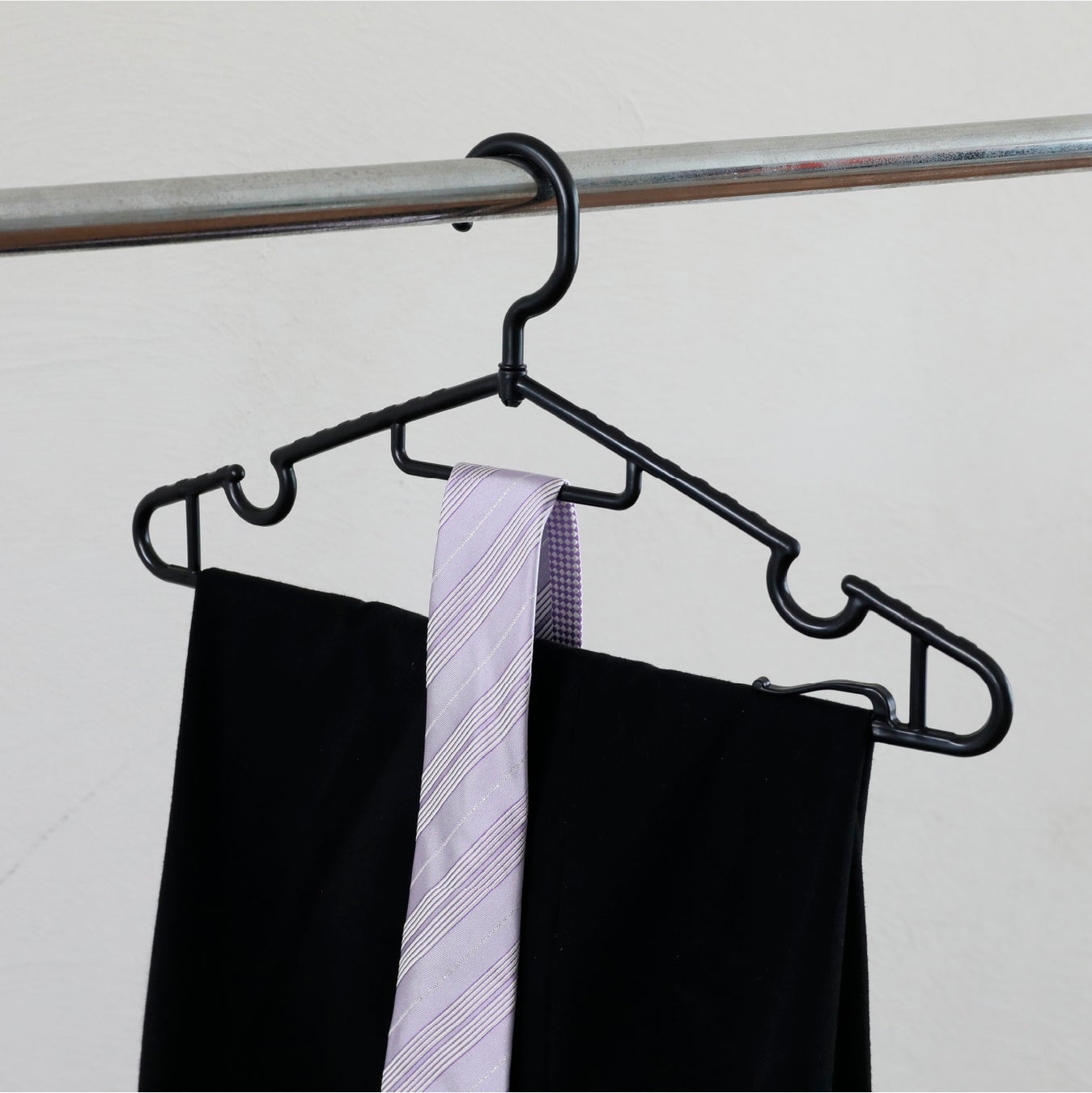 本体にはネクタイ掛けと肩紐掛けがついているのでキャミソールやインナー、スカーフなども干しやすく、1本のハンガーで複数の役割を果たしてくれます。