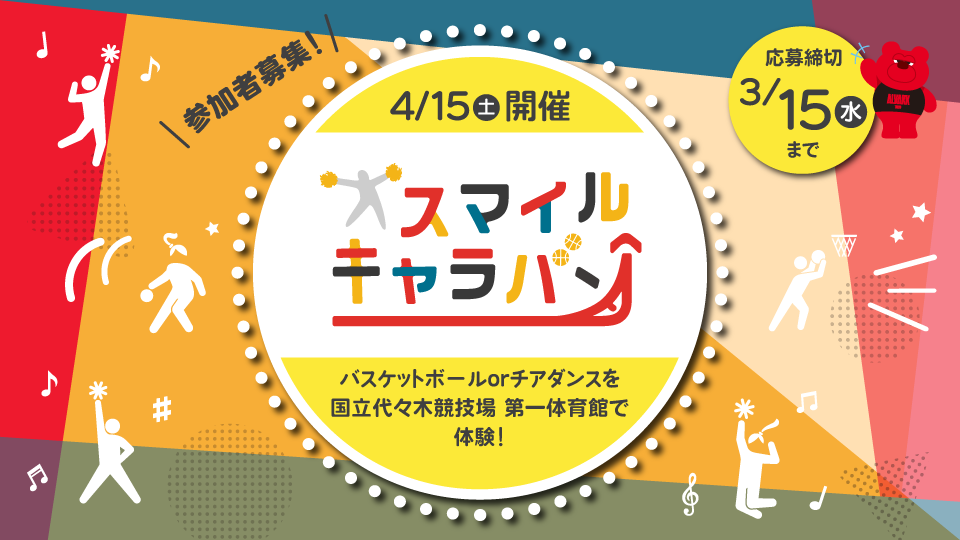 損保ジャパン×アルバルク東京×KINTO特別企画 「スマイルキャラバン」を国立代々木競技場第一体育館で開催! 抽選で70名(バスケ40名、チア30名)のお子さまにワクワク体験をお届け