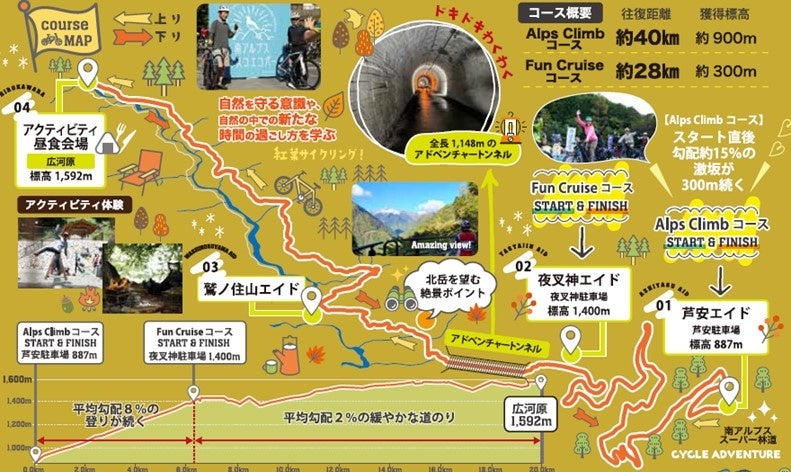 コースプログラムは、南アルプスのアドベンチャーにチャレンジする「Alps Climb(アルプス クライム)コース/往復距離約40km」と、誰もが楽しめ南アルプスを満喫できる「Fun Cruise(ファン クルーズ)コース/往復距離約28km」からお選びいただけます。なお、サイクリングに慣れていない方や体力に自身のない方のために、電動マウンテンバイク(e-MTB)のレンタルもご用意しております。詳細情報は本ツアー特設ウェブサイト(https://cycle-adventure.com/)をご確認ください。