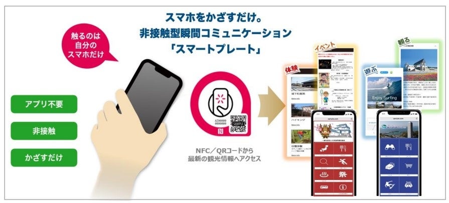 (2)観光客等の皆さまが観光施設・駅・飲食店・宿泊施設などの当該地域内外に設置している「スマートプレート™」に「スマートフォン」をかざすことで、両観光協会の会員事業者が発信する情報コンテンツを確認することが可能です。非接触により「スマートプレート™」から情報コンテンツの取得が可能なため、感染対策としても適しています。