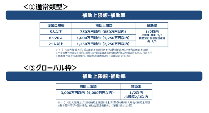 通常類型とグローバル枠があり、補助額上限・補助率は以下のようになっている。