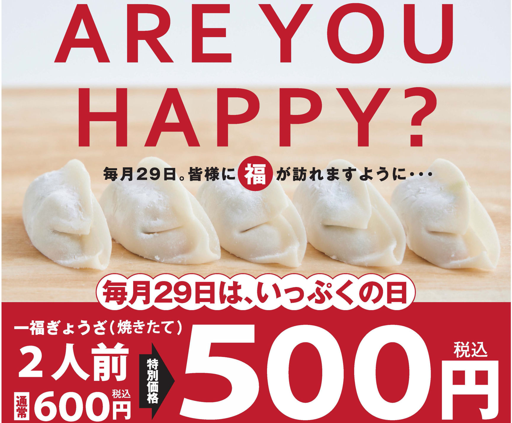 ~毎月29日に皆さんに福が訪れることを願い、暑さを吹き飛ばす焼きたてぎょうざ500円キャンペーン開催します~