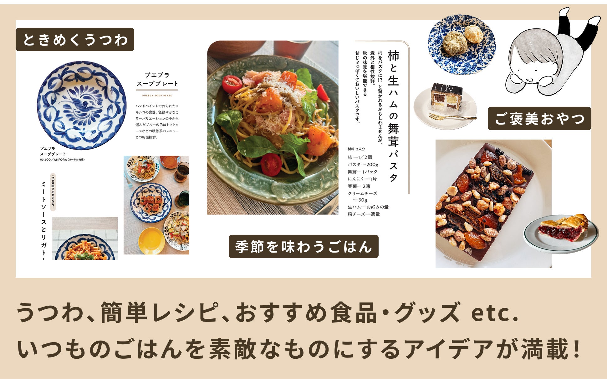 うつわと料理の合わせ方や、季節の食材を使ったレシピ、生活の質を上げてくれる調理器具やおすすめの食品も紹介。