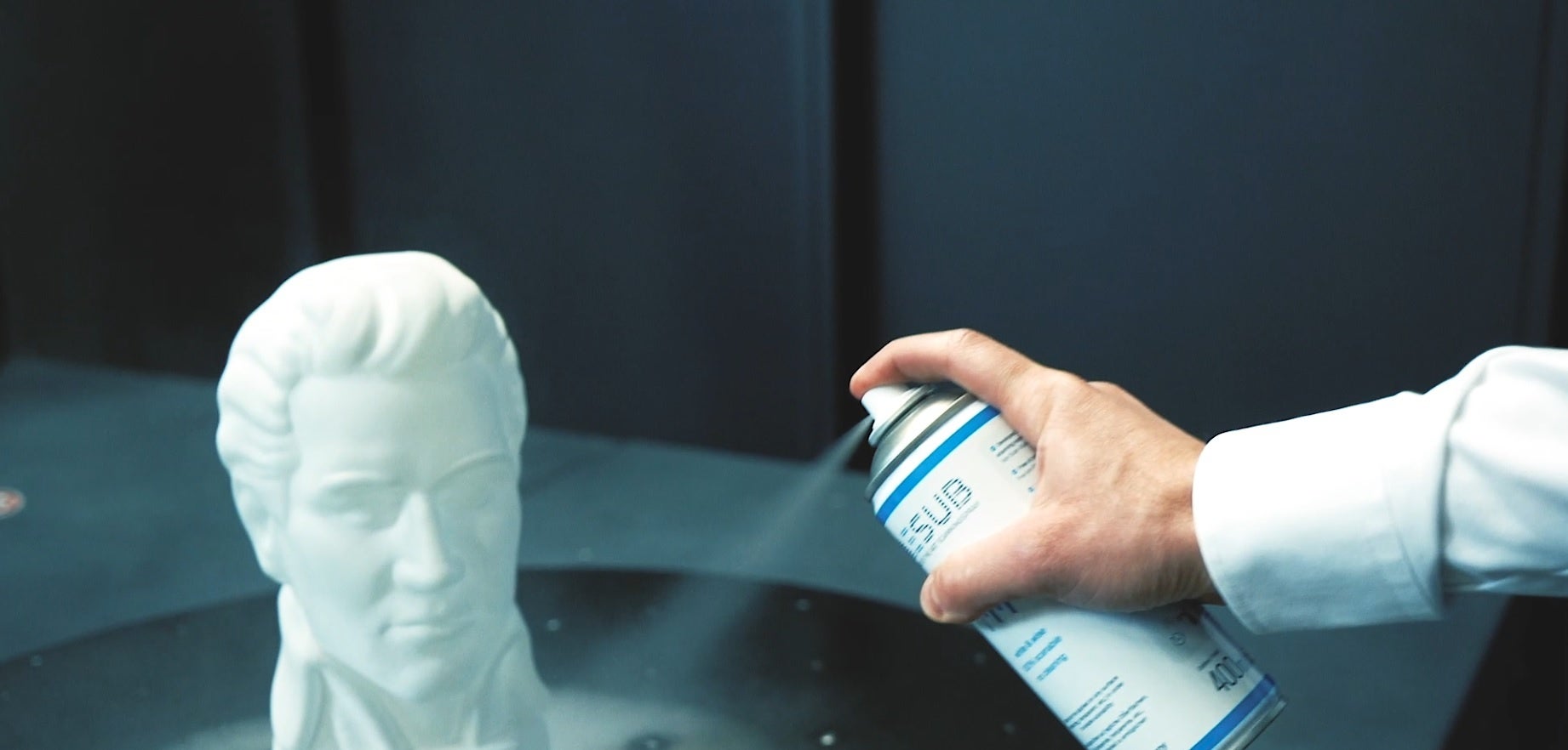 3Dスキャン時に対象物を認識し易くする為、白色の薄いコーティングスプレーを塗布します。同社のスプレーは、自然昇華する為、スキャン後の清掃等、後処理が不要で大好評です。