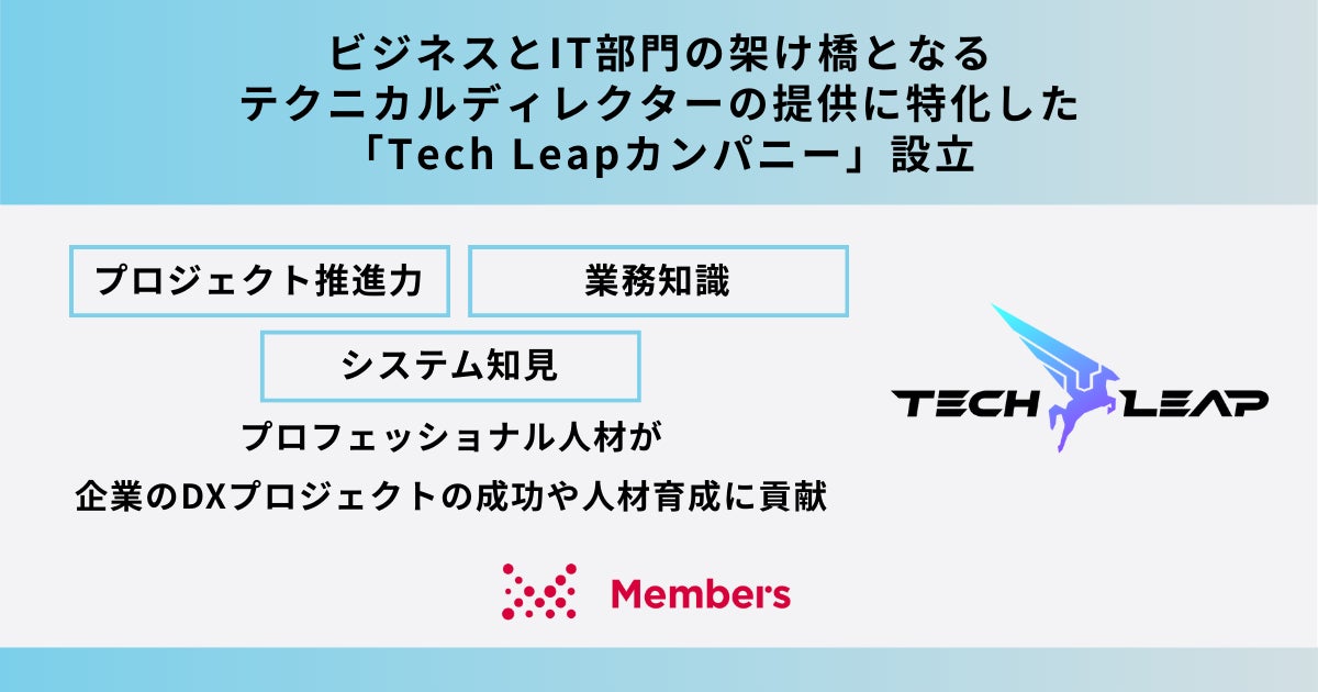 DX現場支援で顧客と共に社会変革をリードする株式会社メンバーズ(本社:東京都中央区、代表取締役社長:髙野 明彦、東証プライム:2130、以下「メンバーズ」)は、企業のDX推進にあたり、ビジネス部門とIT部門の架け橋となり、プロジェクトの企画・推進を行うテクニカルディレクターの提供に特化した専門組織「Tech Leapカンパニー(テックリープカンパニー)」を2025年4月1日付で設立したことをお知らせします。